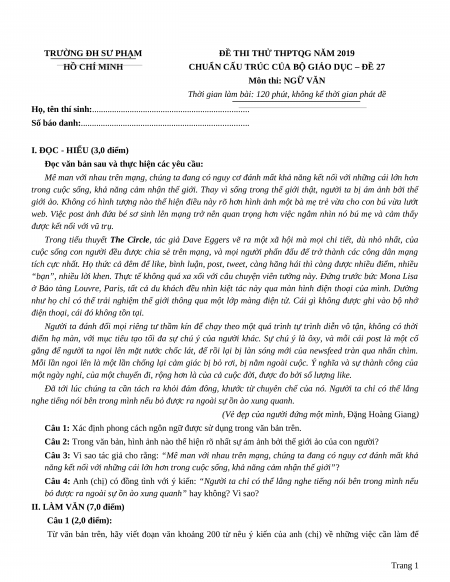 CHUẨN CẤU TRÚC CỦA BỘ GIÁO DỤC – ĐỀ 27 Môn thi: NGỮ VĂN