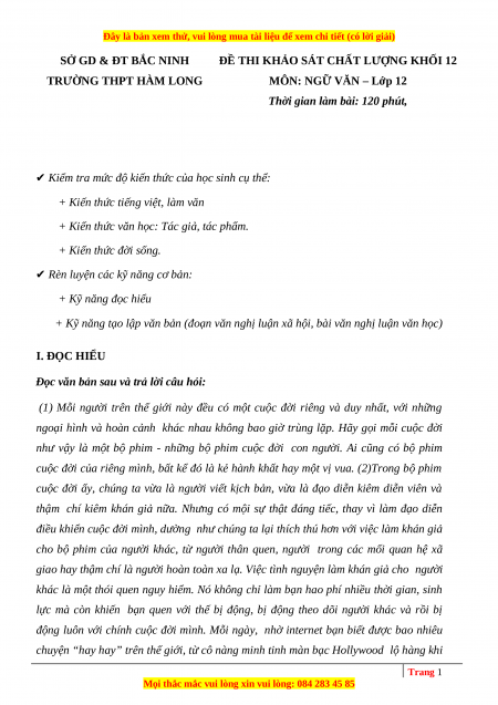 + Kỹ năng tạo lập văn bản (đoạn văn nghị luận xã hội, bài văn nghị luận văn học) I. ĐỌC HIỂU