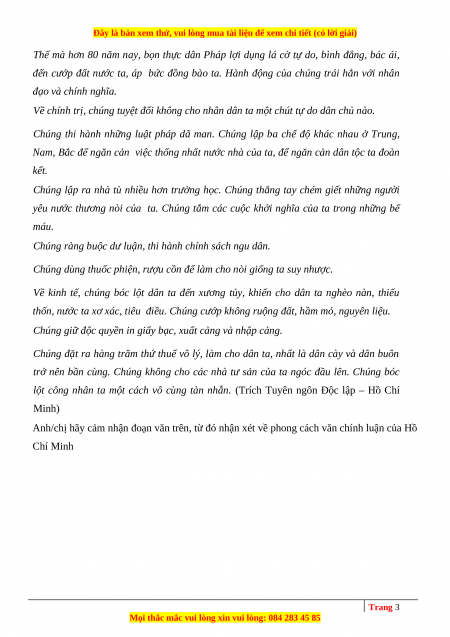Anh/chị hãy cảm nhận đoạn văn trên, từ đó nhận xét về phong cách văn chính luận của Hồ Chí Minh 2 Trang 3
