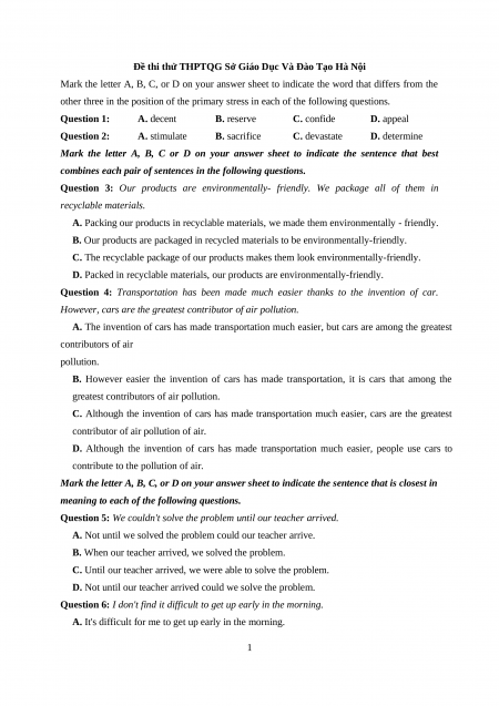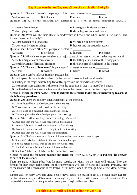 Section 6: Mark the letter A, B, C, or D to indicate the sentence that is closest in meaning to each of the following questions.