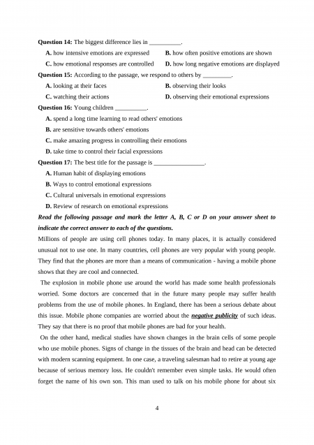 Section 4: Mark the letter A, B, C or D to indicate the correct answer to each of the following questions.