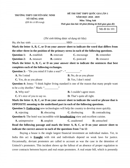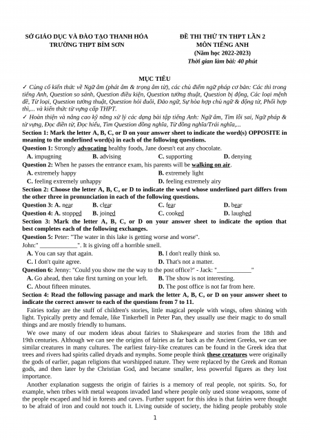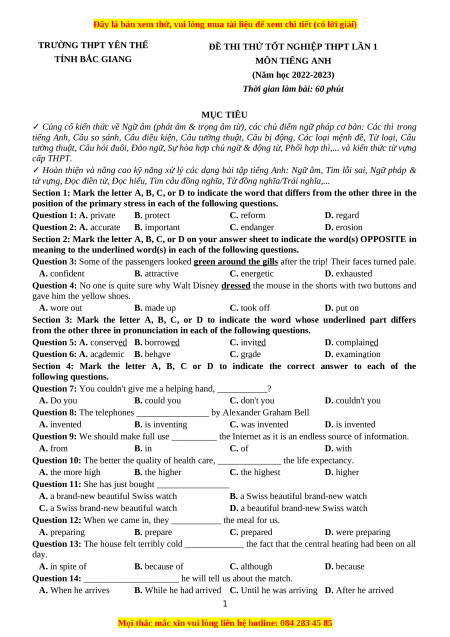ĐỀ THI THỬ TỐT NGHIỆP THPT LẦN 1 TỈNH BẮC GIANG MÔN TIẾNG ANH (Năm học 2022-2023)