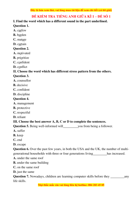I. Find the word which has a different sound in the part underlined. Question 1. A. curfew B. burden C. mature D. curtain Question 2. A. motivated B. prioritize C. confident D. conflict