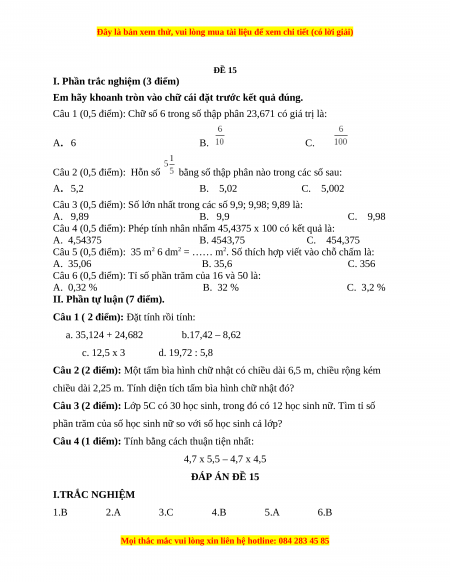 Câu 4 (1 điểm): Tính bằng cách thuận tiện nhất: 4,7 x 5,5 – 4,7 x 4,5 ĐÁP ÁN ĐỀ 15 I.TRẮC NGHIỆM 1.B 2.A 3.C 4.B 5.A 6.B