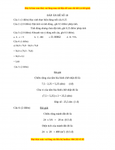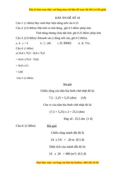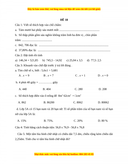 b. C. 280 c. D. 80062 d. B. 75%. Câu 4: (1 điểm) a) 56,8 x 76,9 - 56,8 x 76,8 = 56,8 x (76,9 - 76,8) = 56,8 x 0,1 = 5,68 Câu 5: (2 điểm) Bài giải