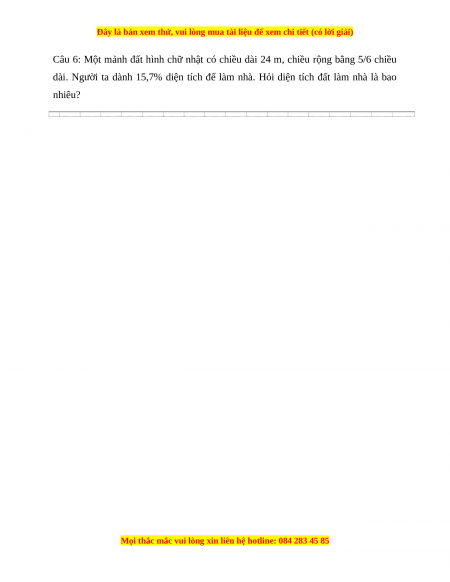 Câu 6: Một mảnh đất hình chữ nhật có chiều dài 24 m, chiều rộng bằng 5/6 chiều