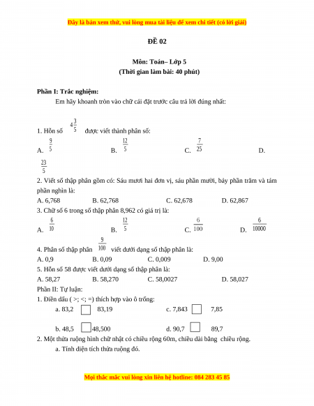 ĐỀ 02 Môn: Toán– Lớp 5