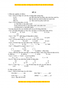 Câu 3: Số thập phân gồm có: bảy chục, hai đơn vị và năm phần trăm viết là: A. 702,50 B. 72,05 C. 720,5 D. 27,05 Câu 4: Viết