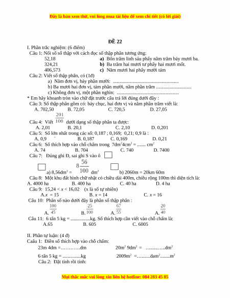 Bộ đề thi Toán 5 học kì 1 năm 2022 - 2023 - Đề 22