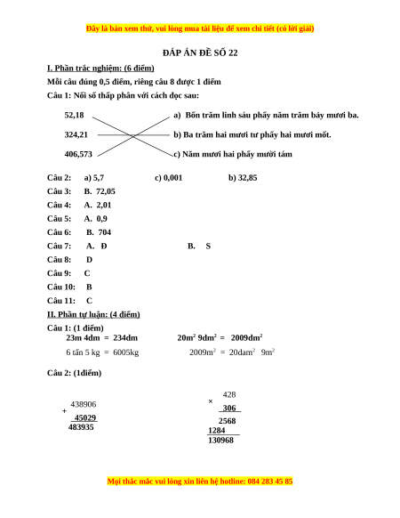 Câu 2: a) 5,7 c) 0,001 b) 32,85 Câu 3: B. 72,05 Câu 4: A. 2,01 Câu 5: A. 0,9 Câu 6: B. 704 Câu 7: A. Đ B. S Câu 8: D Câu 9: C Câu 10: B Câu 11: C