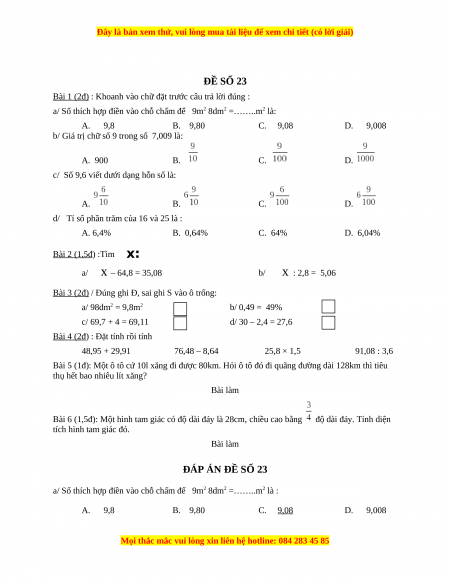 Bài 6 (1,5đ): Một hình tam giác có độ dài đáy là 28cm, chiều cao bằng độ dài đáy. Tính diện tích hình tam giác đó. Bài làm ĐÁP ÁN ĐỀ SỐ 23