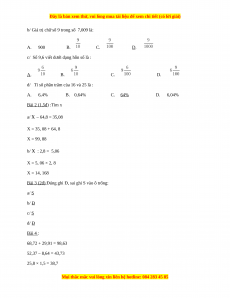 A. 6,4% B. 0,64% C. 64% D. 6,04% Bài 2 (1,5đ) :Tìm x a/ x – 64,8 = 35,08 X = 35, 08 + 64, 8 X = 99, 88 b/ x : 2,8 = 5,06 X = 5, 06 × 2, 8 X = 14, 168 Bà