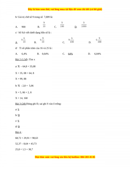 d/ Tỉ số phần trăm của 16 và 25 là : A. 6,4% B. 0,64% C. 64% D. 6,04% Bài 2 (1,5đ) :Tìm x: a/ x – 64,8 = 35,08 b/ x : 2,8 = 5,06