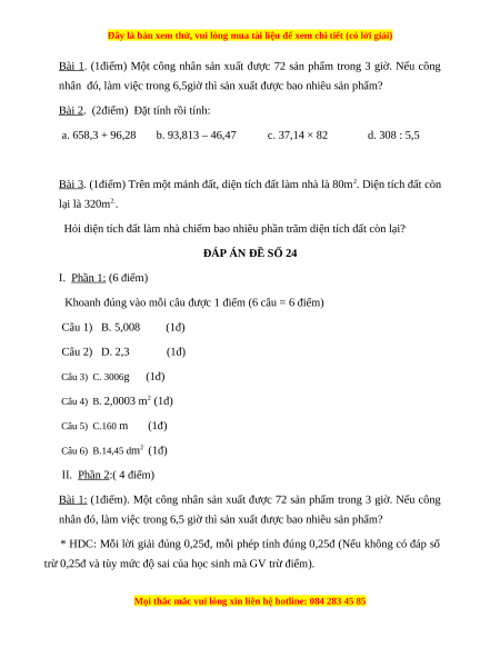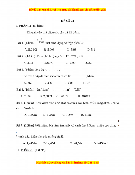 Khoanh đúng vào mỗi câu được 1 điểm (6 câu = 6 điểm) Câu 1) B. 5,008 (1đ) Câu 2) D. 2,3 (1đ) Câu 3) C. 3006g (1đ) Câu 4) B. 2,0003 m2 (1đ) Câu 5) C.160 m (1đ) Câu 6) B.14,45 dm2 (1đ) II. Phần 2:( 4 điểm)
