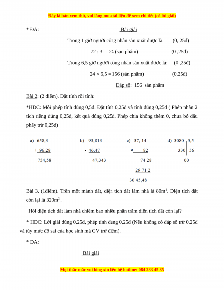 tích riêng đúng 0,25đ, kết quả đúng 0,25đ. Phép chia không thêm 0, chưa bỏ dấu phẩy trừ 0,25đ)
