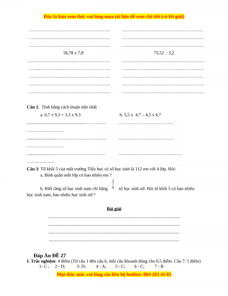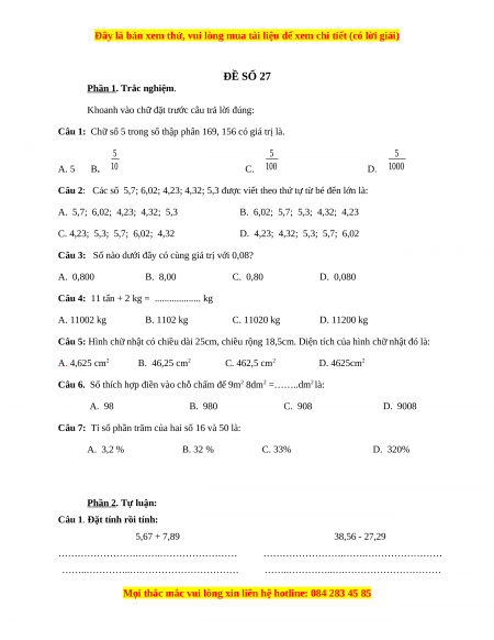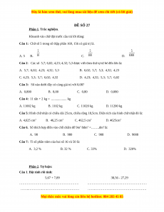 Bộ đề thi Toán 5 học kì 1 năm 2022 - 2023 - Đề 27