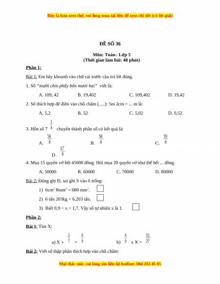 ĐỀ SỐ 36 Môn: Toán– Lớp 5