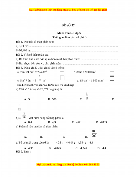 ĐỀ SỐ 37 Môn: Toán– Lớp 5