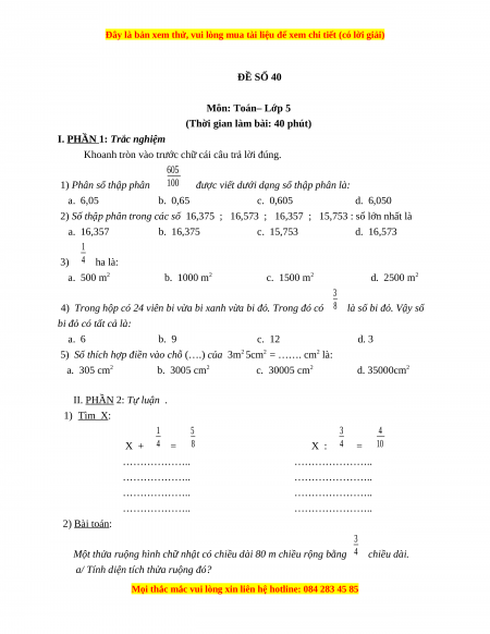 ĐỀ SỐ 40 Môn: Toán– Lớp 5