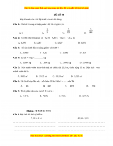 Câu 1: Chữ số 5 trong số thập phân 143, 56 có giá trị là. 5 5 5 A. 5 B. 10 C. 100 D. 1000