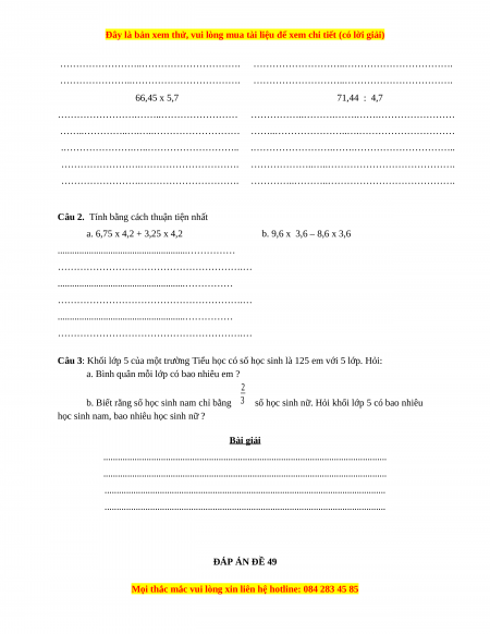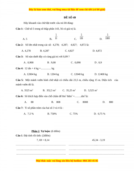 Bộ đề thi Toán 5 học kì 1 năm 2022 - 2023 - Đề 49