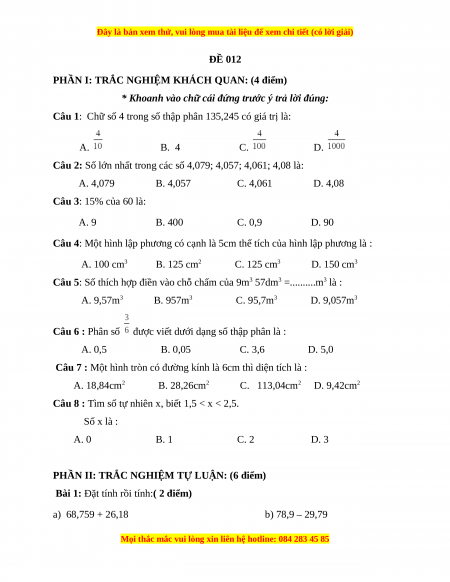 Câu 1: Chữ số 4 trong số thập phân 135,245 có giá trị là: A. B. 4 C. D.