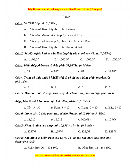 Câu 6: Trong các số thập phân sau, số nào lớn hơn số 12,014: (0,5 điểm) A. 12,012 B. 12,015 C. 012,013 D. 12,006
