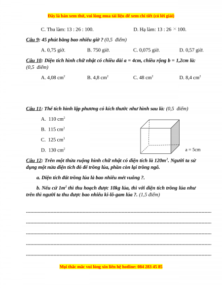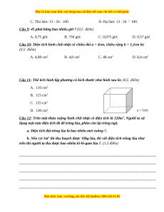 Câu 9: 45 phút bằng bao nhiêu giờ ? (0,5 điểm) A. 0,75 giờ. B. 750 giờ. C. 0,075 giờ. D. 0,57 giờ.