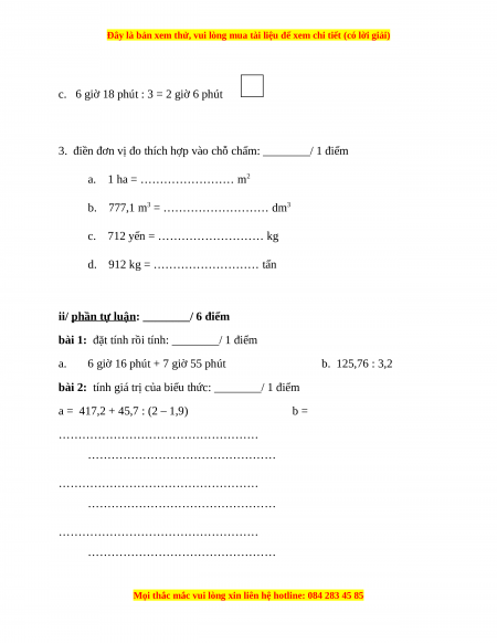3. điền đơn vị đo thích hợp vào chỗ chấm: ________/ 1 điểm