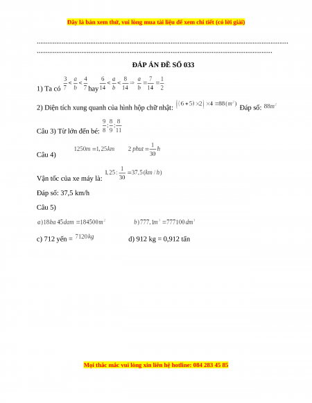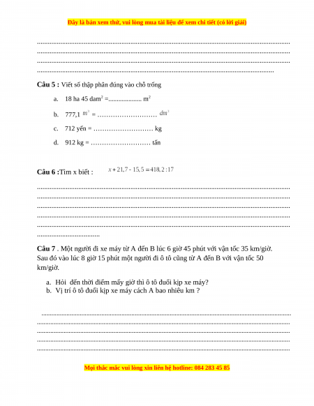 Vận tốc của xe máy là: Đáp số: 37,5 km/h Câu 5) c) 712 yến = d) 912 kg = 0,912 tấn