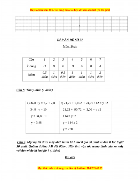 ĐÁP ÁN ĐỀ SỐ 37 Môn: Toán Câu 1 2 3 4 5 6 7 Ý đúng D D B D A B A 0,5 1 0,5 1 1 1 2 Điểm