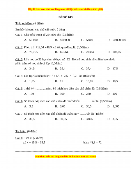 Câu 7: Số thích hợp điền vào chỗ chấm để 3tấn5kg = …… tấn là: (1điểm) A. 30,5 B. 30,05 C. 3,005 D. 3,05 Tự luận: (6 điểm) Câu 8: Tìm x: (2 điểm)