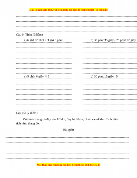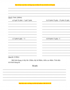 b) 33 phút 35 giây - 25 phút 22 giây c) 5 phút 6 giây 5 d) 30 phút 15 giây : 5 Câu 10: (2 điểm)