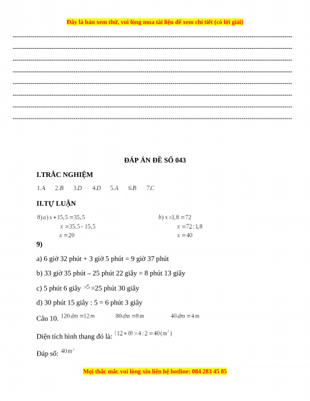 ĐÁP ÁN ĐỀ SỐ 043 I.TRẮC NGHIỆM II.TỰ LUẬN 9)