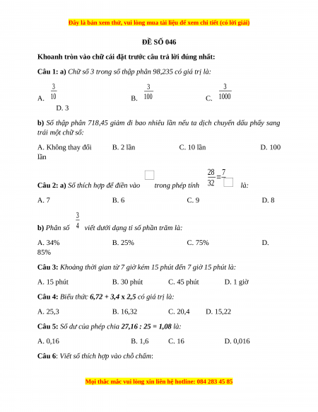 Câu 5: Số dư của phép chia 27,16 : 25 = 1,08 là: A. 0,16 B. 1,6 C. 16 D. 0,016