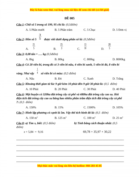 Bộ đề thi Toán 5 học kì 2 năm 2022 - 2023 - Đề 5