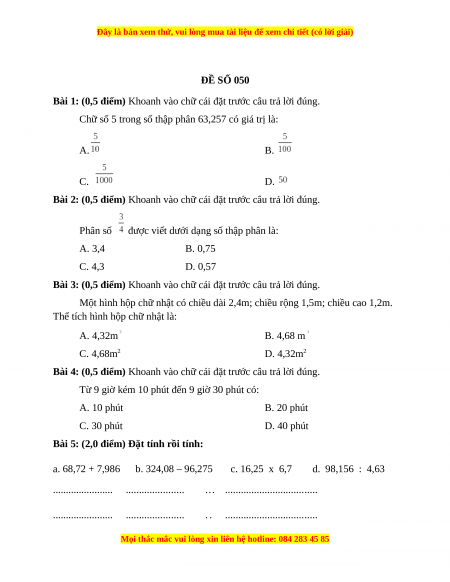 Bộ đề thi Toán 5 học kì 2 năm 2022 - 2023 - Đề 50