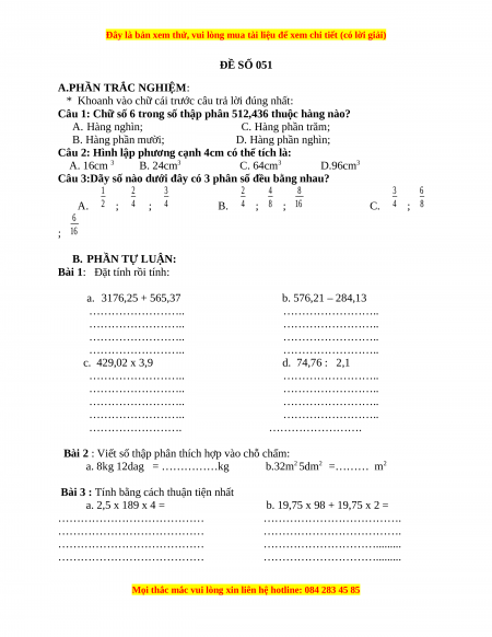 Bộ đề thi Toán 5 học kì 2 năm 2022 - 2023 - Đề 51