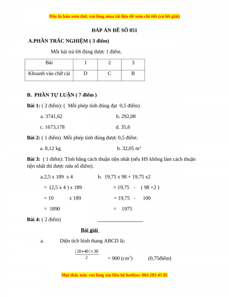 ĐÁP ÁN ĐỀ SỐ 051