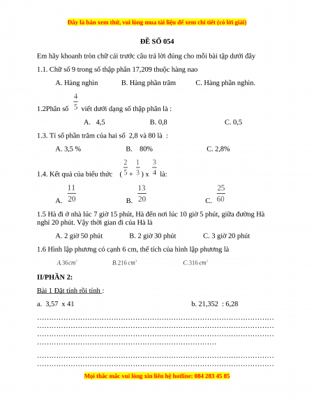 Bộ đề thi Toán 5 học kì 2 năm 2022 - 2023 - Đề 54