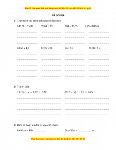1/ Thực hiện các phép tính sau (có đặt tính) 245,58 + 7,492 59,64 + 38 104 – 36,85 2,49– 0,8745 .............................. .............................. .............................. .............................. .............................. .............................. .............................. .............................. .............................. .............................. .............................. .............................. 28,52 x 4,9 12,75 x 38 26 : 2,5 20,88 : 3,6 .............................. .............................. .............................. .............................. .............................. .............................. .............................. .............................. .............................. .............................. .............................. .............................. .............................. .............................. .............................. .............................. .............................. .............................. .............................. .............................. 2/ Tìm y, biết : 13,104 : y – 8,72 = 6,88 (312 – y) : 12,6 = 24,5