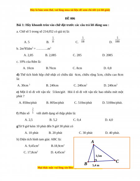 Bộ đề thi Toán 5 học kì 2 năm 2022 - 2023 - Đề 6