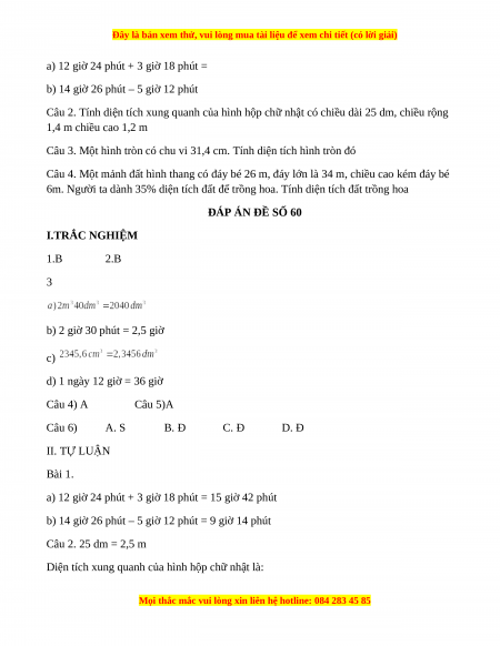 b) 2 giờ 30 phút = 2,5 giờ c) d) 1 ngày 12 giờ = 36 giờ Câu 4) A Câu 5)A Câu 6) A. S B. Đ C. Đ D. Đ II. TỰ LUẬN Bài 1.
