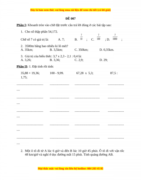 Bộ đề thi Toán 5 học kì 2 năm 2022 - 2023 - Đề 7
