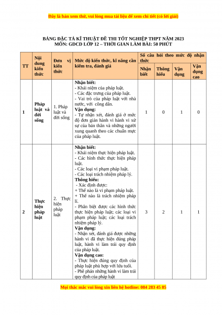 BẢNG ĐẶC TẢ KĨ THUẬT ĐỀ THI TỐT NGHIỆP THPT NĂM 2023