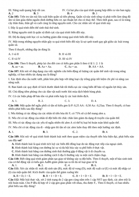 Câu 106: Theo lí thuyết, phép lai cho đời con có kiểu gen phân li theo tỉ lệ 1: 2: 1 là A. aa × aa. B. Aa × Aa.