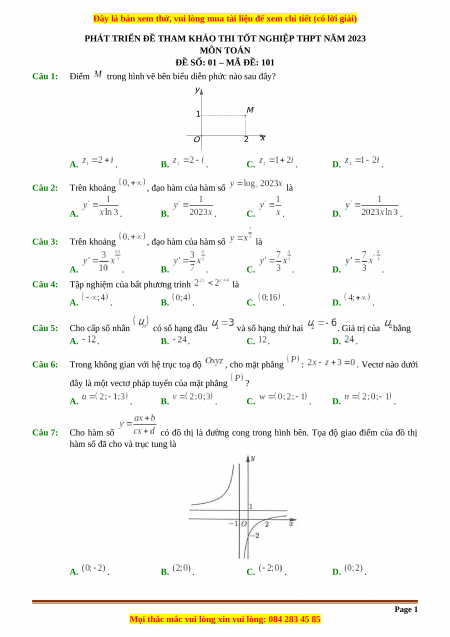 trong hình vẽ bên biểu diễn phức nào sau đây? y 1 M O 2 x A. . B. . C. . D. . Câu 2: Trên khoảng , đạo hàm của hàm số là A. . B. . C. . D. . Câu 3: Trên khoảng , đạo hàm của hàm số là A. . B. . C. . D. . Câu 4: