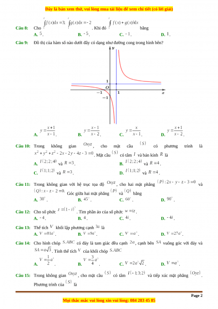 Câu 8: Cho . Khi đó bằng A. . B. . C. . D. . Câu 9:
