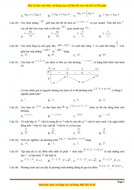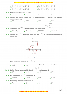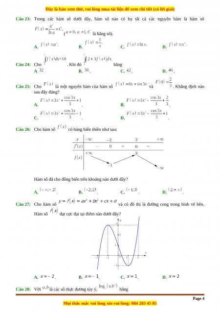 là một nguyên hàm của hàm số và . Khẳng định nào sau đây đúng? A. . B. . C. . D. . Câu 26: Cho hàm số