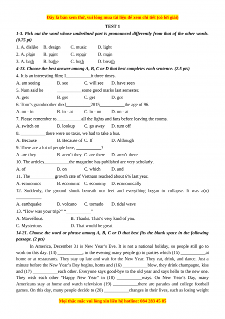 1-3. Pick out the word whose underlined part is pronounced differently from that of the other words. (0.75 pt) 1. A. dislike B. design C. music D. light 2. A. plain B. paint C. repair D. main 3. A. bath B. bathe C. both D. breath